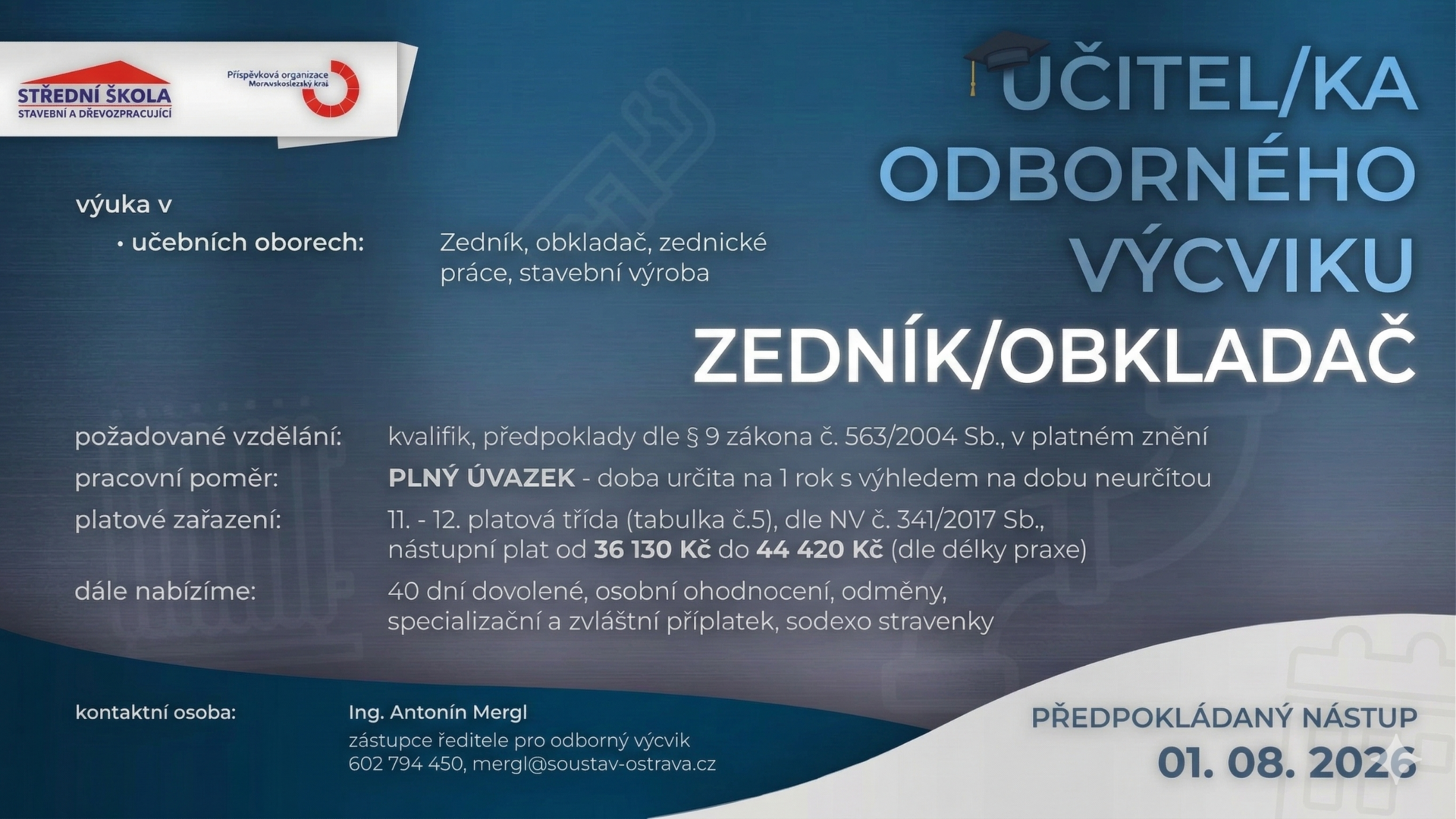 Nabízíme zkrácené studium v denní formě vzdělávání pro již vyučené ve stavebních a dřevozpracujících oborech a pro absolventy vybraných maturitních oborů.